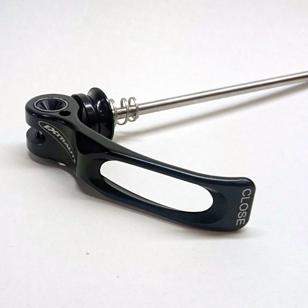MTB specific quick releases, butter-smooth operation, 3D cnc ergonomic levers, self-lubing bushings, nuts and levers with self adjusting base-plates, spring retainers, forged-butted-honed aerospace Titanium GRD5 rods (1,3 ton pull strenght). Black-blue-gold-red-silver-green-orange-purple anodized with laser etched graphics, 55g (pair)